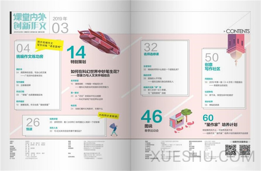《课堂内外·创新作文》主要栏目:思想、语言、情感、创网、专题讲解、技巧、精当例文等。